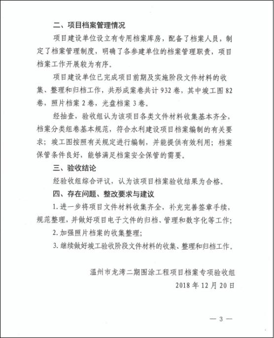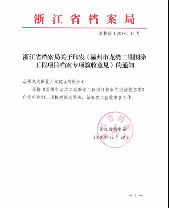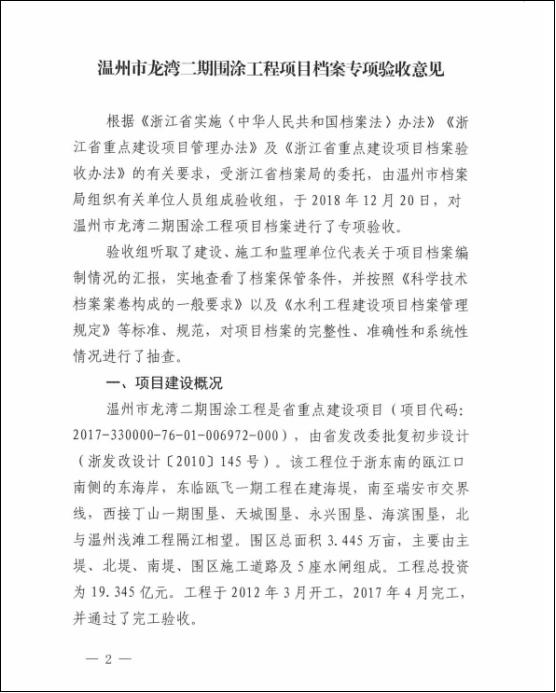 ¿ËÈÕÊÕϤÕã½Ê¡µµ°¸¾Ö¹ØÓÚÓ¡·¢¡¶ÎÂÖÝÊÐÁúÍå¶þÆÚΧͿ¹¤³ÌÏîÄ¿µµ°¸×¨ÏîÑéÊÕÒâ¼û¡·µÄ֪ͨ£¨ÕãµµÑ顾2018¡¿17ºÅ£©¡£2018Äê12ÔÂ20ÈÕ£¬ÊÜÊ¡µµ°¸¾ÖίÍУ¬ÎÂÖÝÊеµ°¸¾ÖÍŽáÊÐË®Àû¾ÖºÍÇøµµ°¸¹Ý¶ÔÎÂÖÝÊÐÁúÍå¶þÆÚΧͿ¹¤³Ì¾ÙÐеµ°¸ÑéÊÕÏÖ³¡Ä¥Á·¡£