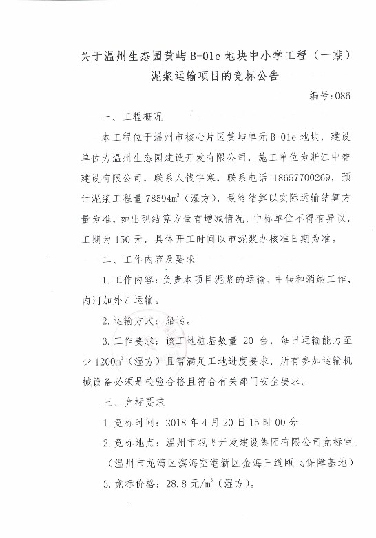 ¹ØÓÚÎÂÖÝÉú̬԰»ÆÓìB-01eµØ¿éÖÐСѧ¹¤³Ì£¨Ò»ÆÚ£©ÄཬÔËÊäÏîÄ¿µÄ¾º±êͨ¸æ