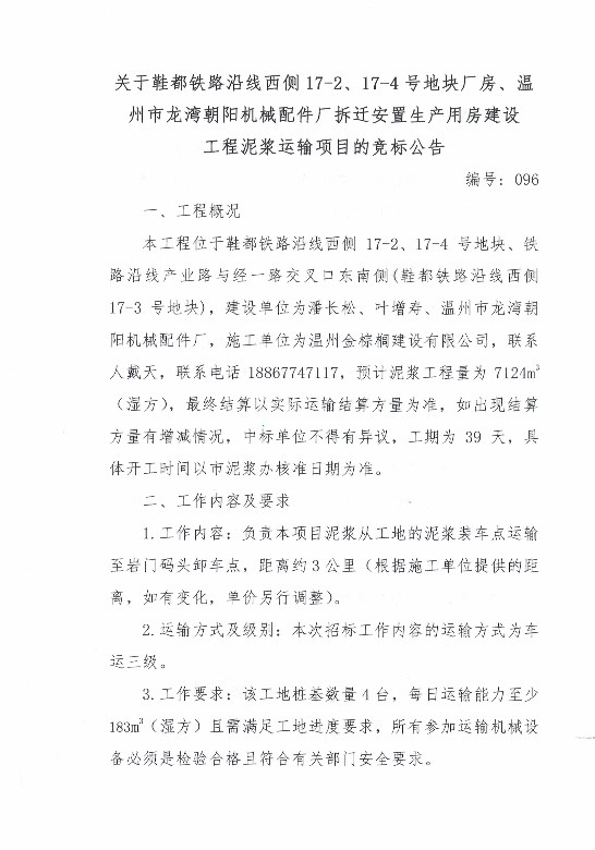 ¹ØÓÚЬ¶¼ÌúÂ·ÑØÏßÎ÷²à17-2¡¢17-4ºÅµØ¿é³§·¿¡¢ÎÂÖÝÊÐÁúÍåÏòÑô»úеÅä¼þ³§²ðǨ°²¶ÙÉú²úÓ÷¿½¨É蹤³ÌÄཬÔËÊäÏîÄ¿µÄ¾º±êͨ¸æ